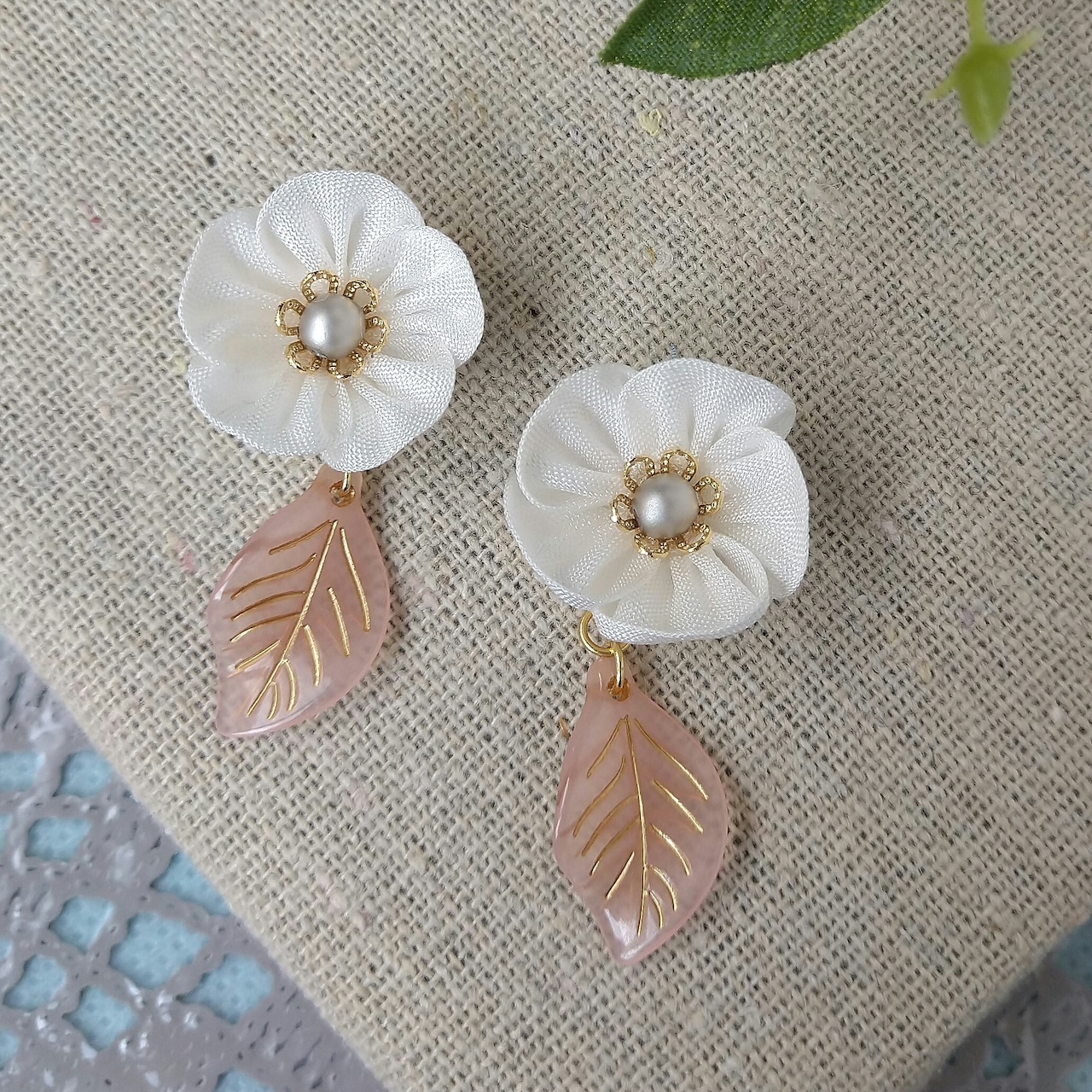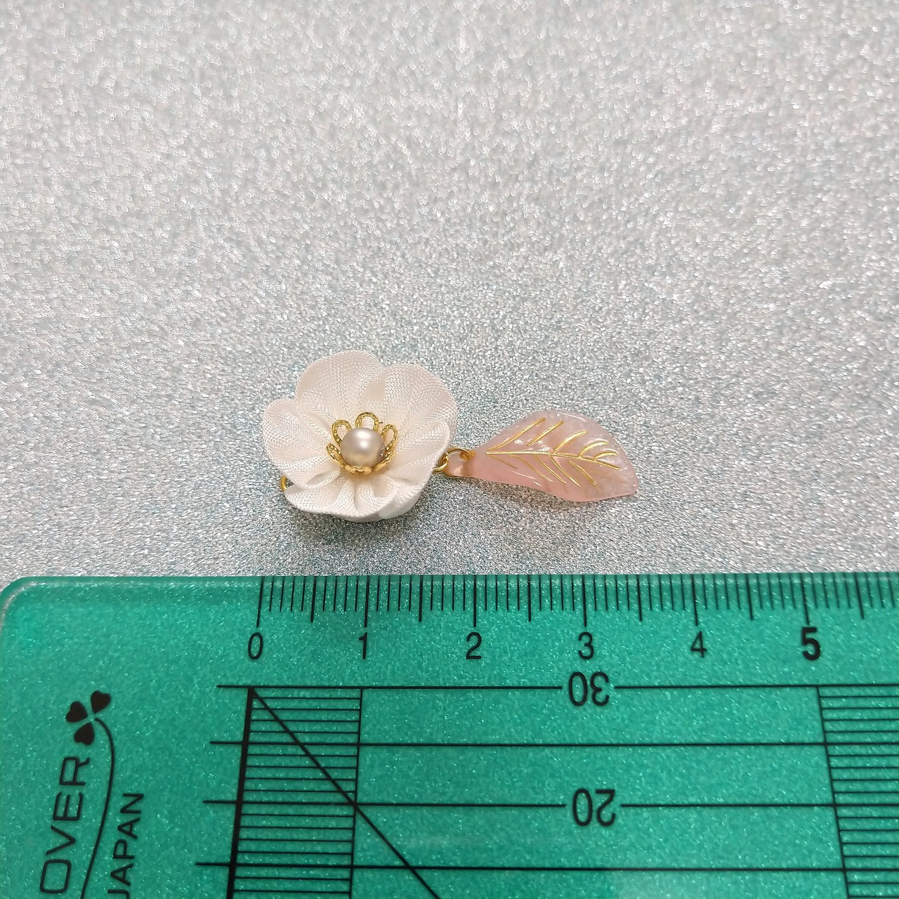 白色のひだよせつまみのお花に、ピンクの葉のビーズをつけました。
